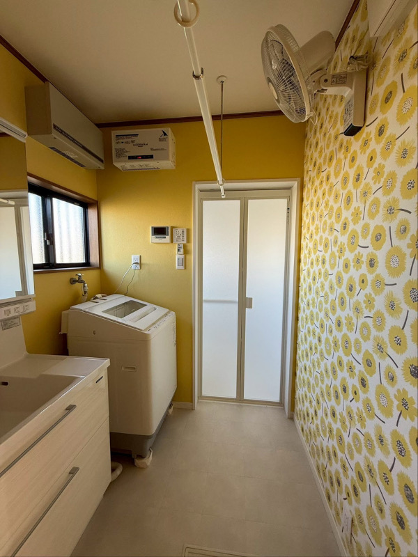 壁出し水栓で掃除しやすく、内装はお客様大好きな黄色のお花をアクセントにしました。